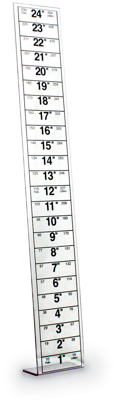 The Mail Measure Bump is placed on top of letter or flats that are in a mail tub. The angled end of the bump hooks onto the mail and is then pushed forward to compact the mail to get an accurate measure. Made of clear acrylic to easily see while measuring. Size: 3 9/16" x 24".